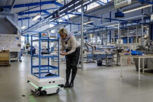 Outro exemplo é o robot móvel MiR100, que a EPL apresentou em Novembro, na Moldplás/FIP 2015. O MiR100 permite a optimização da produtividade reduzindo os custos e libertando parte da carga que, de outra forma, seriam os operadores a suportar. O facto de poderem ser colaborativos, estes robots permitem aos clientes automatizar as suas tarefas de transporte interno e assim libertar recursos humanos para tarefas de maior valor na empresa.